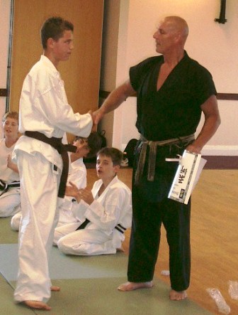 Phillip Pegs receiving his Junior Black Belt from Sensei Graham
