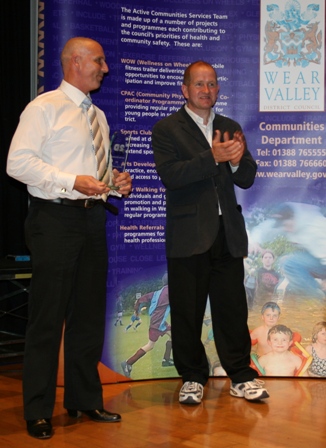 Graham Tomaszko receiving Wear Valley Male Coach of the year award from Eddie (the eagle) Edwards